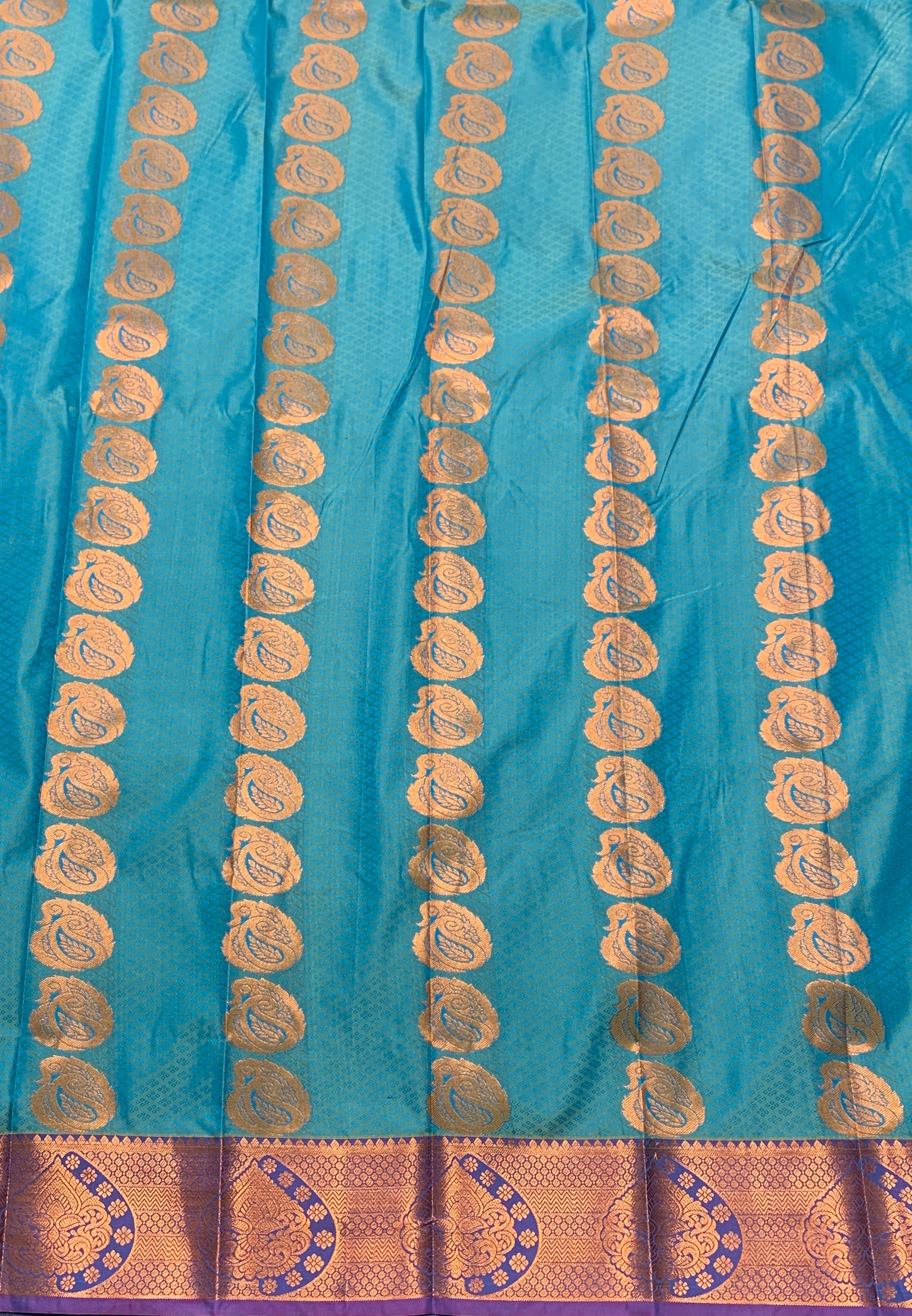 Vegan Silk Saree Sapphire Colour with Flower design. Copper and Maroon Border with Flower design.